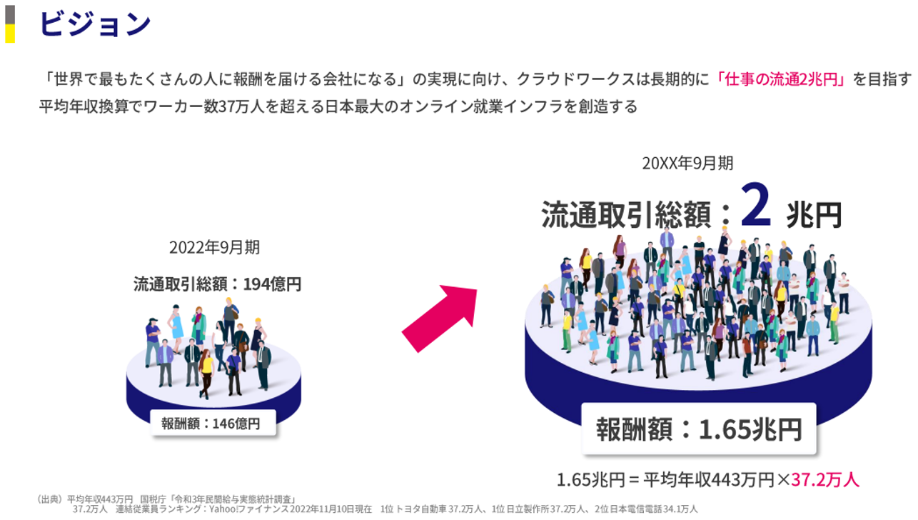 事業内容:「世界で最もたくさんの人に報酬を届ける会社になる」というビジョンを掲げ、クラウドソーシングプラットフォームの「クラウドワークス」を中心としたインターネットサービスの運営を行う。
