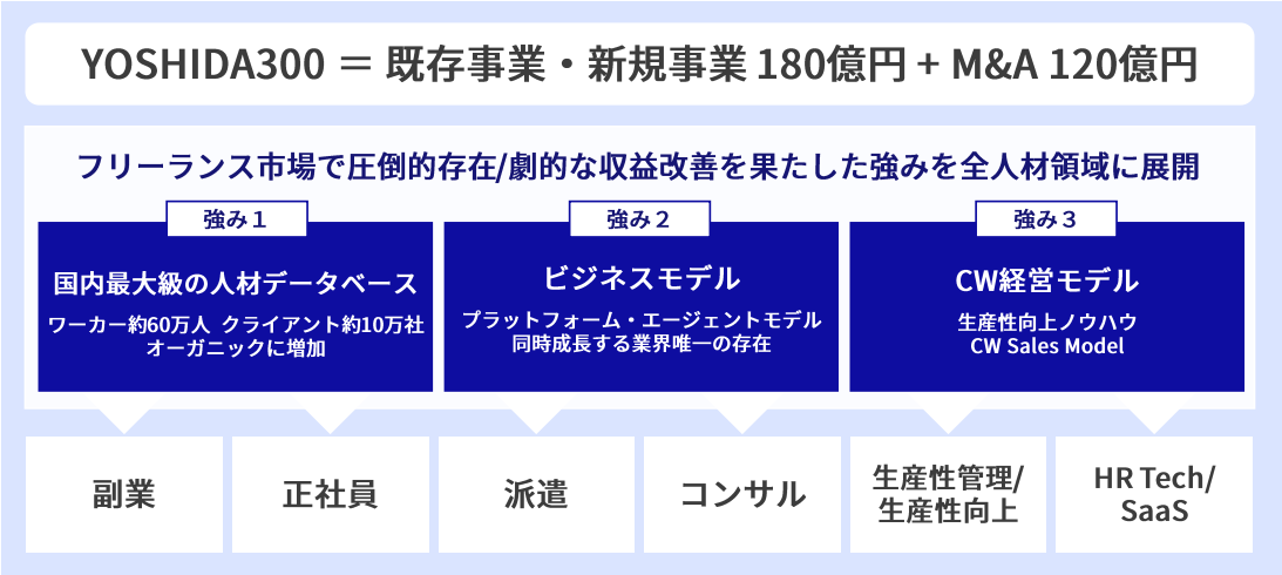吉田氏:まず、一番大きな目標としては売上高300億円です。当社の既存事業と新規事業で180億円、M&Aで120億円のトップラインを作る目標です。そのために「人材流動化の促進」「人的資本経営ツール提供」「生産性向上ソリューション提供」という3つの事業戦略を策定しました。