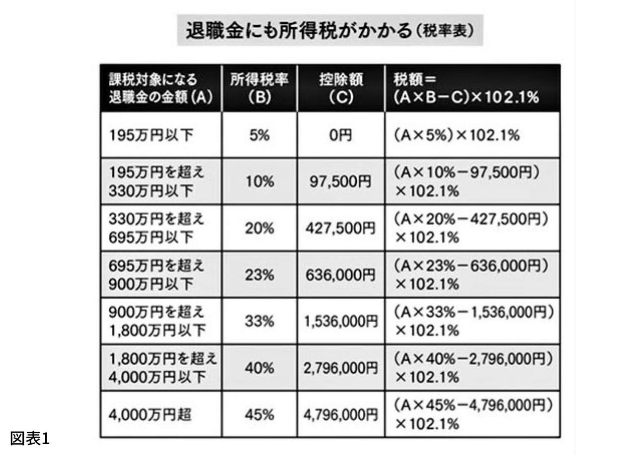 ①の退職所得控除は、40万円×20年=800万円になり、2,260万円−800万円=1,460万円です。