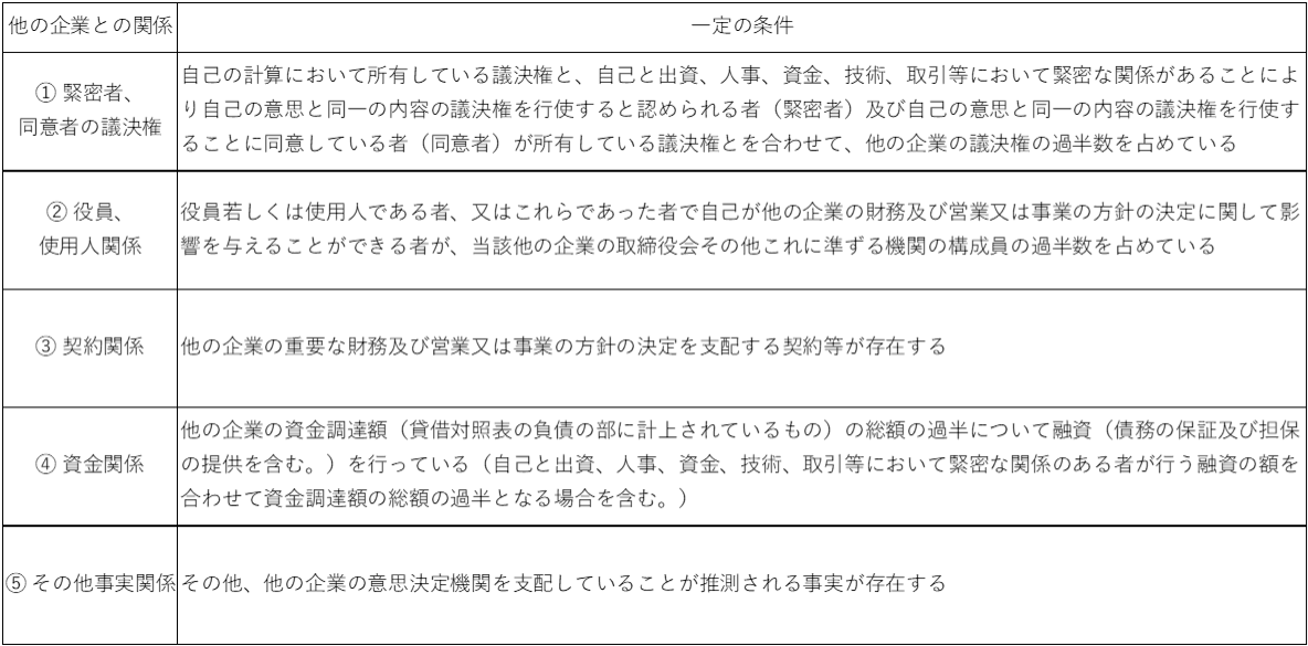 また子会社の判定基準として他の企業の議決権の所有割合が50%超であることが判定基準となっています。今回、日本テレビが取得したのは42.3%になるので、上記の判定基準から少し不足する形になります。ただこのような場合においても、他の企業の議決権の40%~50%を自己の計算において所有しており、緊密者の議決権や役員関係など一定の条件を充たす場合には、「実質的支配基準」に該当し、子会社と判定されるケースがあります。