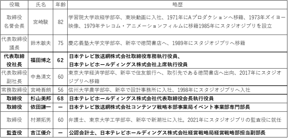 代表取締役の鈴木敏夫氏としては、宮崎駿氏の息子である吾郎氏に経営を託すことも考えていたようですが、宮崎駿氏の反対と、吾郎氏自身の意向もあり、かねてより親交のあった日本テレビにスタジオジブリ側から打診をして子会社化に至っています。