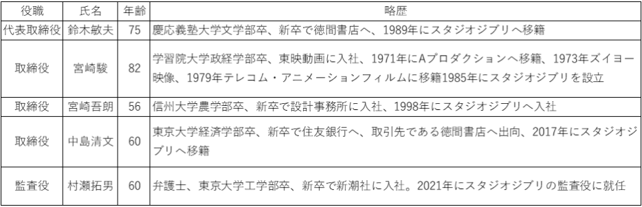 また社長が引退する平均年齢は68.8歳となっており、設立メンバーである宮崎駿氏(82歳)、鈴木氏(75歳)も長い期間、後継者問題に苦悩されていたことが伺えます。