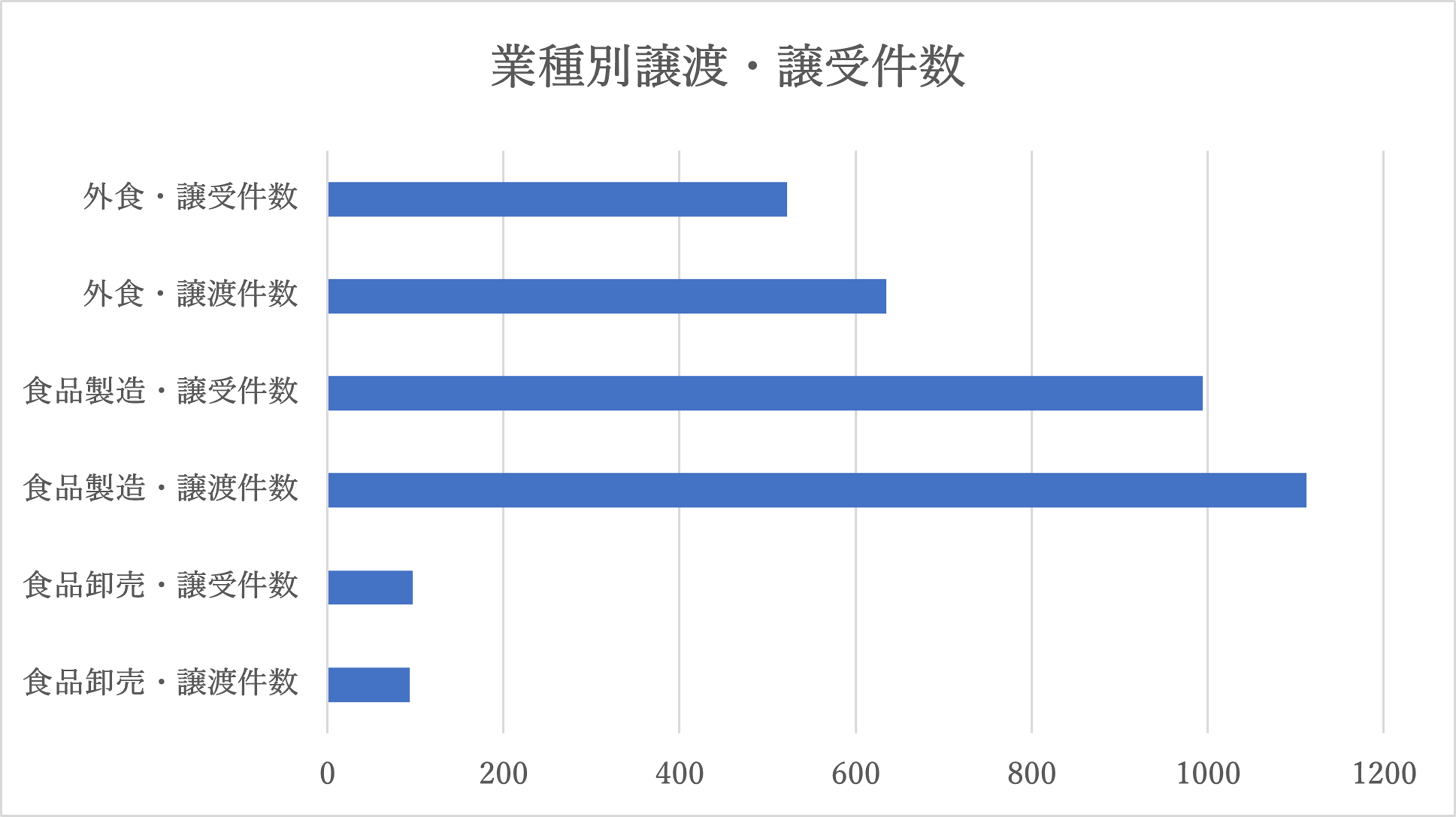 他業種と比較してみると、食品製造業の企業が譲渡した件数は1112件、譲受けた件数は994件であり、外食の譲渡した企業の数は635件、譲受けた企業の数は522件であることから、食品卸売業界のM&A件数は比較的に少ないことがわかります。件数が比較的少ないのは、市場規模によるものが大きいと思いますが、一方で、着目すべきは「卸売業同士のM&A件数が少ない」という事実です。