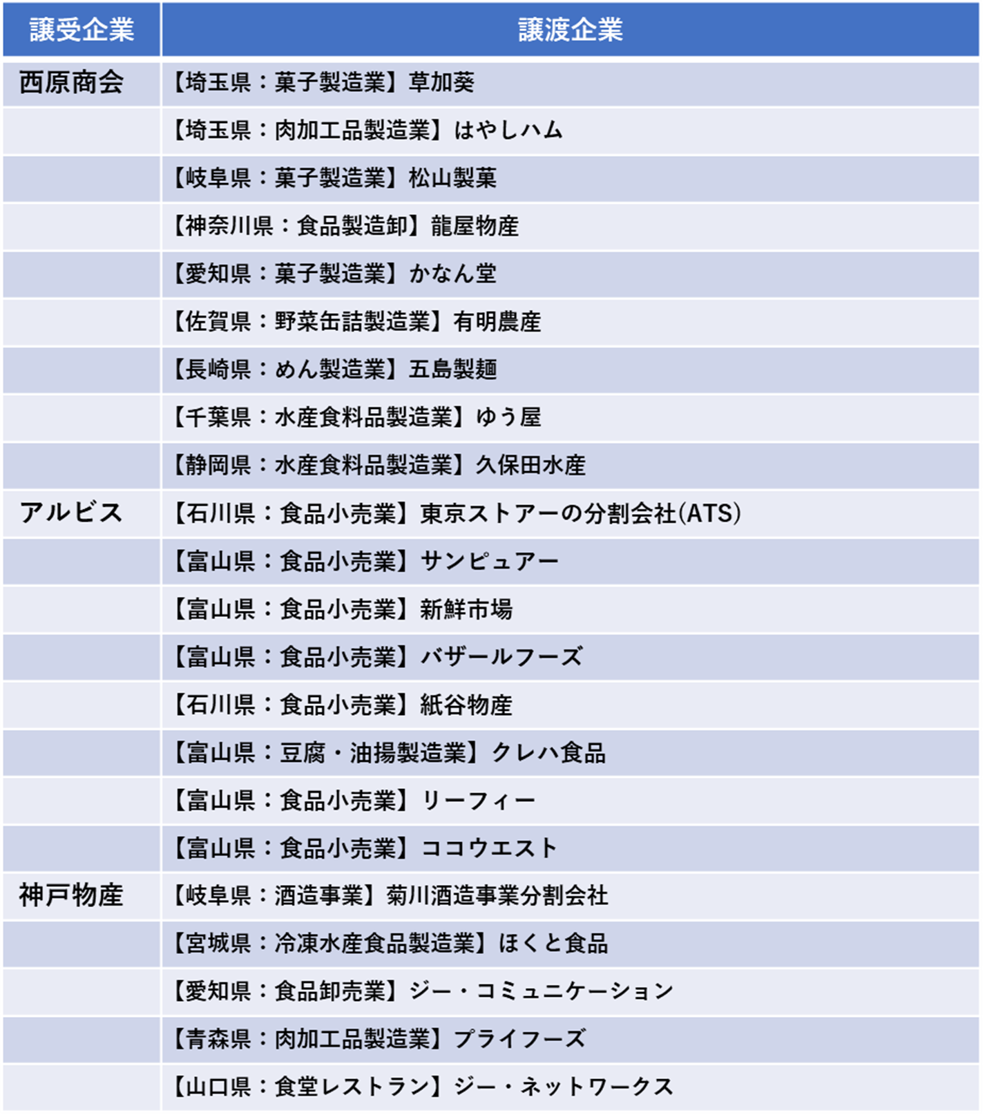 上記に名を挙げた神戸物産までの3社が行うM&Aの中で、食品卸売業の企業を買収しているという事例は極めて少ないことがわかります(下記表を参照)。