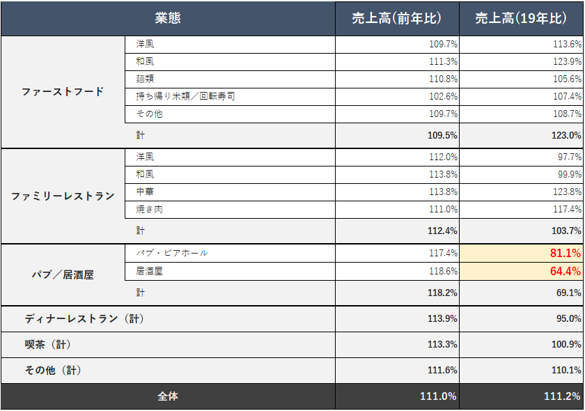 一方、宴会需要の減った居酒屋・パブ業態では前年度からは売上高を約118%伸ばしていますが、19年度比で見るとまだ70%にも満たない水準となりました。
