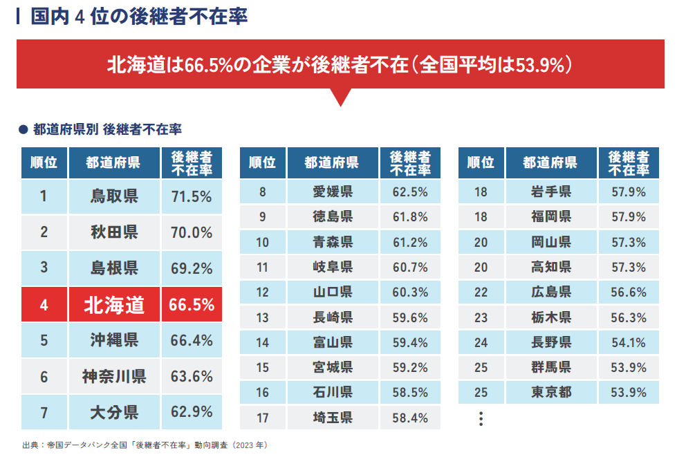 上述の通り、帝国データバンクの調査(北海道「後継者不在率」動向調査(2023年))では、後継者不在率が66.5%と過去最低となり、金融機関や会計事務所、自治体などに事業承継の相談窓口が普及したことで改善傾向がみられます。
