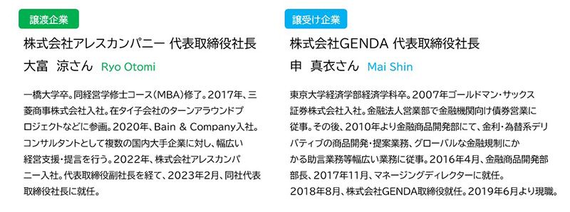 日本M&Aセンターが発刊する広報誌「MAVITA」Vol.3で掲載した、M&Aを戦略の柱に躍進を続けるエンターテイメント企業GENDAの申 真衣社長と、サーチファンドの仕組みを利用して経営者となり、事業承継後2年目にして売上高を2倍に伸ばしGENDAにグループインしたアレスカンパニーの大富 涼社長の対談をお届けいたします。