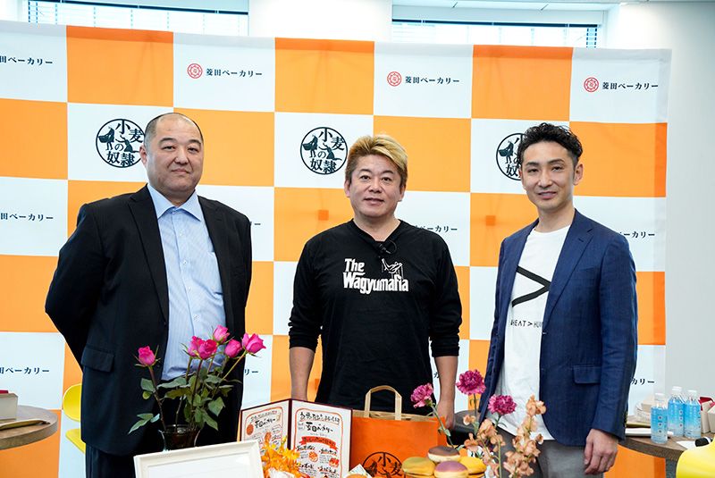 左から、菱田ベーカリー 菱田仁 代表取締役社長、こむぎの 堀江貴文 経営戦略顧問、こむぎの 笹山直人 代表取締役社長