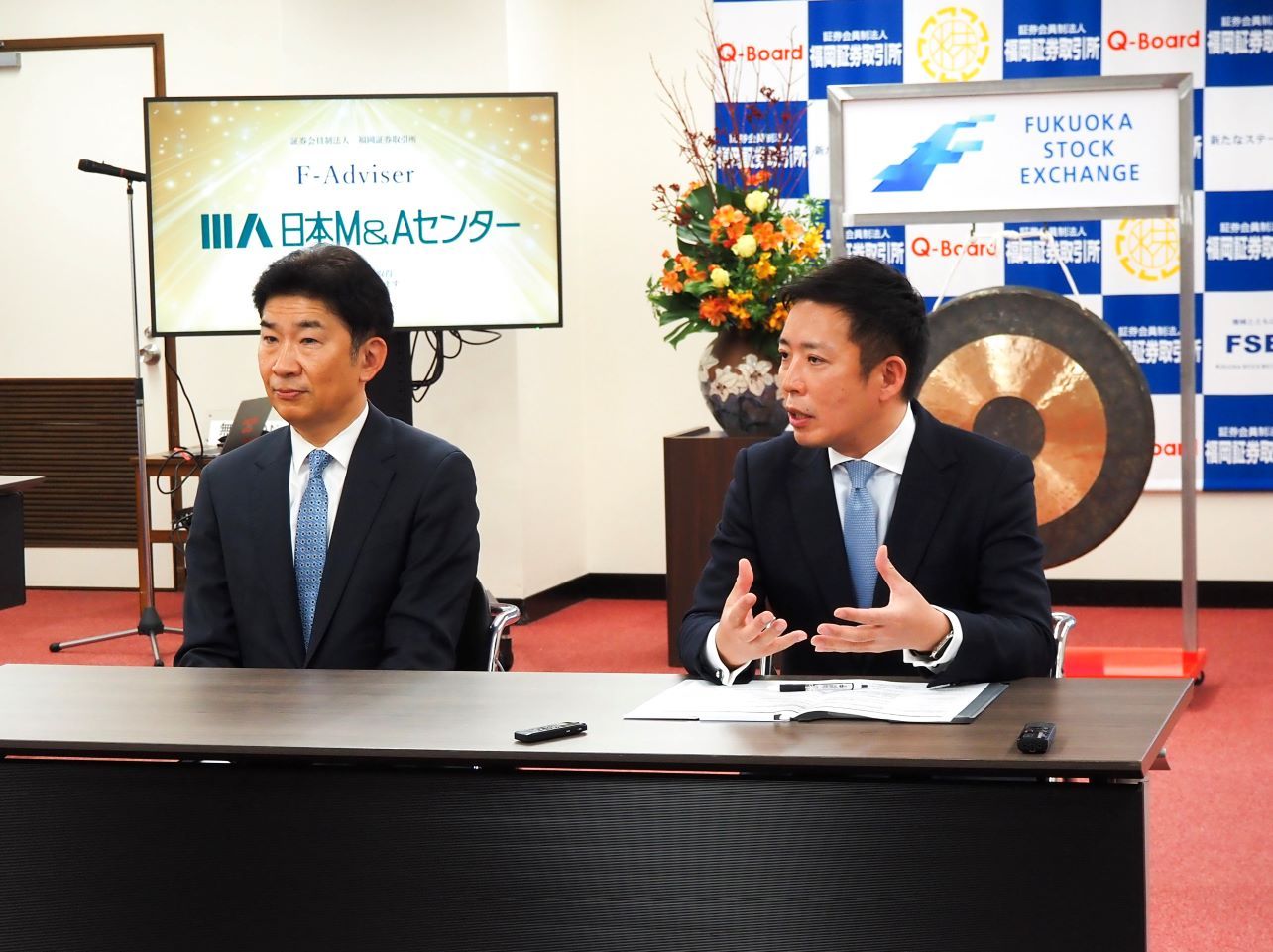 日本M&Aセンター竹内直樹社長は福岡証券取引所で開かれた記者会見にて、F-Adviser取得の理由について「お客様から福岡プロマーケット上場を目指したいと要望をいただいた」「提携先金融機関も福岡プロマーケットを盛り上げようとしているなか、地方創生・日本創生を掲げる日本M&Aセンターも参入することとした」と述べました。また今後については、「日本M&Aセンターは東京プロマーケットにおいて現在45社の上場支援実績があり、2028年3月までに100社上場支援を行う予定だが、その10%にあたるまずは10社、この福岡プロマーケットに上場させたい」「九州にスター企業を創出し、九州の発展に貢献していく」と語りました。