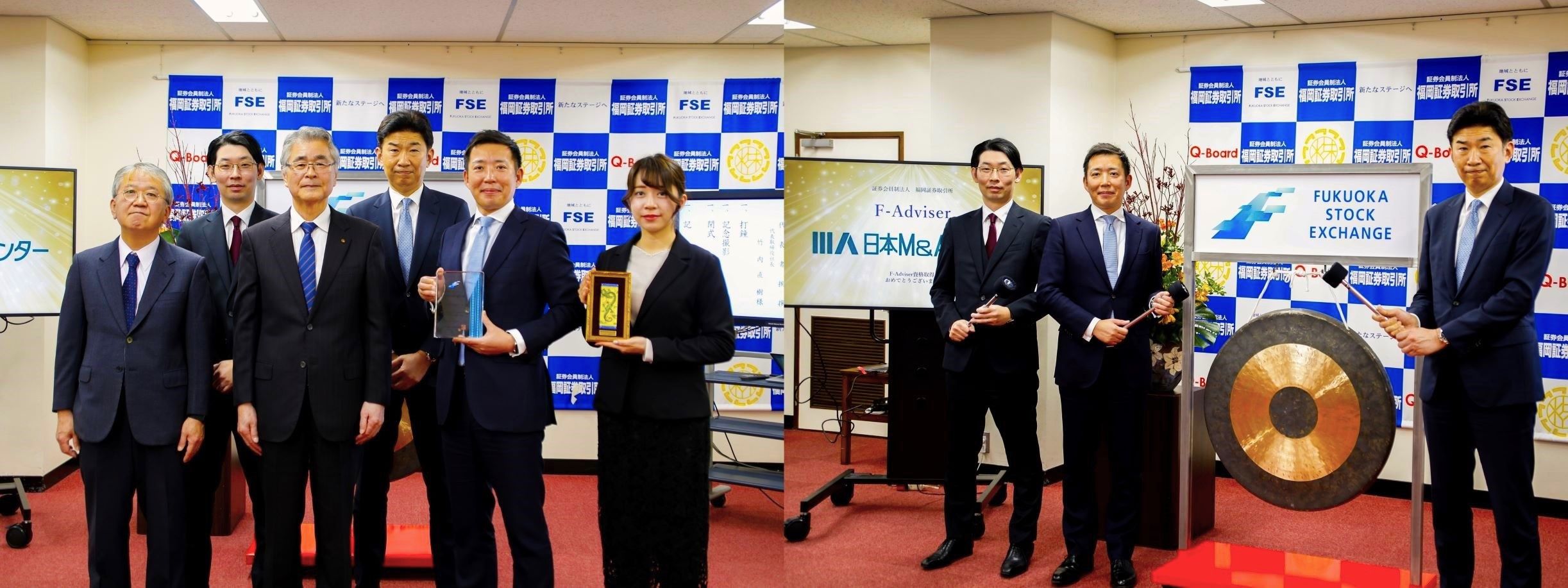 日本M&AセンターへのF-Advisor認定証交付セレモニーが行われたこの日は、竹内社長のほか、TOKYO PRO Market事業部長の幸亀努さんと、九州支店で上場支援を担当する長命大作さんが大きな銅鑼を鳴らし、今後への決意をあらたにしました。