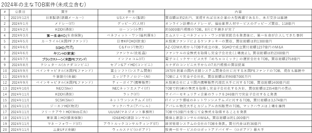 TOBを提案する側としては、できれば友好的、株主にとって最適な提案であれば敵対的TOBも辞さない、という日本の上場企業におけるTOBの位置付けが大きく変わった年といえます。実際、2024年はTOB元年にふさわしい、業界を代表する企業がTOB当事者となっているのが見て取れます。