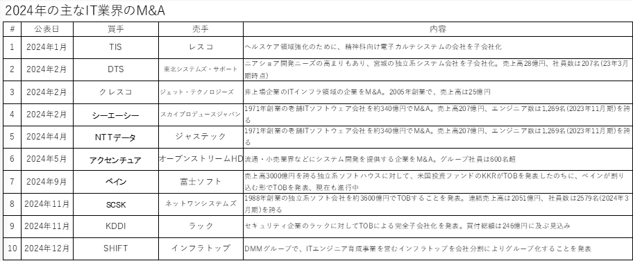 特に今年、印象的だったのがNTTデータや、SCSKなどを始めとするTier1のIT企業がM&Aの買手となり、中堅SIerを買収していった点です。