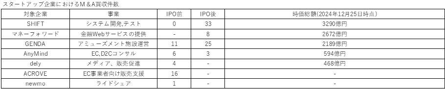 また、GENDAやAnyMind、delyなどのように上場前であってもVCなどから調達した資金を活用して複数のM&Aを実施し、上場後にさらに社内のM&A実行オペレーションを磨いていくスタートアップも増えてます。