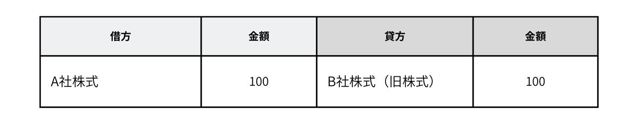 例えば、完全親会社をA社、完全子会社をB社とし、B社株式(旧株式)の帳簿価額を100とした際の税務仕訳は下記の通りです。