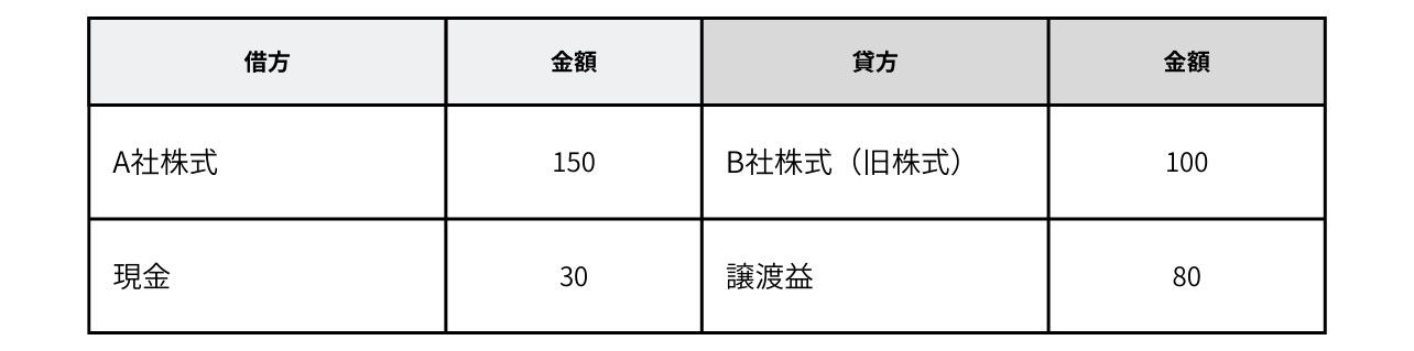 例えば、完全親法人をA社、完全子法人をB社とし、A社株式の時価を150、B社株式(旧株式)の帳簿価額を100と、交付対価の現金を30、とした際の税務仕訳は下記となります。