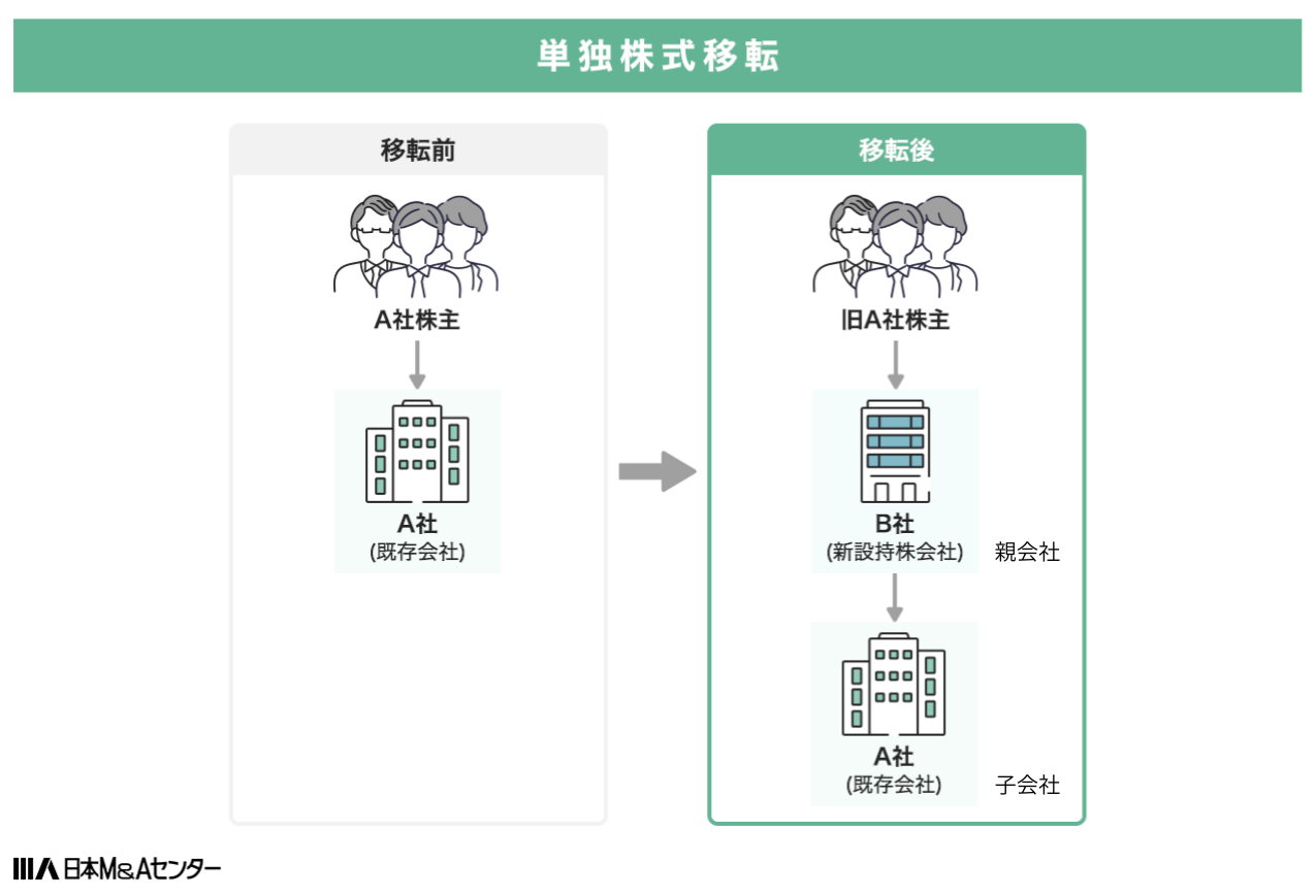 単独株式移転とは、1社が単独で株式移転を行い、自社の全株式を新設会社に取得させて完全親子会社を形成する方法です。