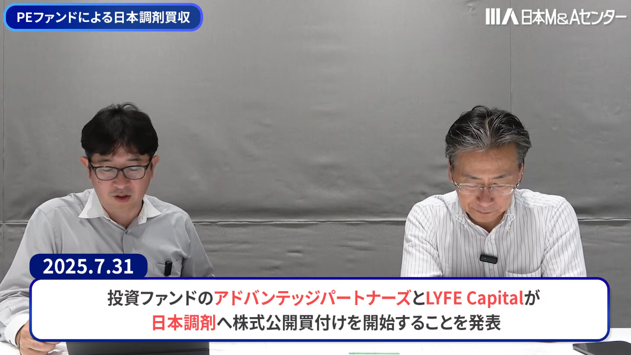 M&A業界の経験豊富な2人が、世の中の企業のM&Aニュースを紐解き解説する「M&Aニュースサテライト」。今回は「 PEファンドのアドバンテッジパートナーズによる日本調剤に対するTOB」を解説します。※本記事はYouTube動画の内容を編集してご紹介します。