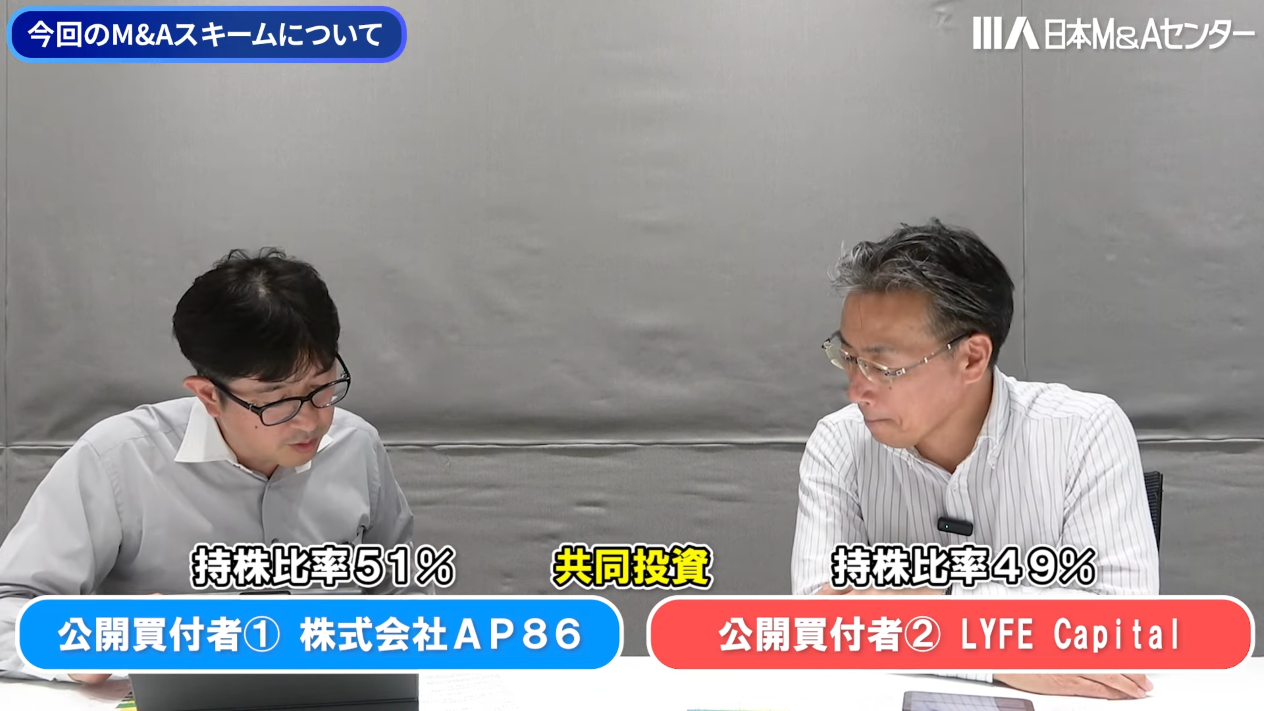 今回は、アドバンテッジパートナーズが準備しているビークル、これはAP86という名がついてますけど、これともう1つ「ライフキャピタル」という米国のヘルスケア領域に強いファンド、です。ここと両者が組んだ共同投資というおそらく51%対49%。51がアドバンデッジパートナーズ側という共同投資という意味で、ややこう面白いスキームですね。他に、臼井さんのほうでスキームの面で気になることありましたか?