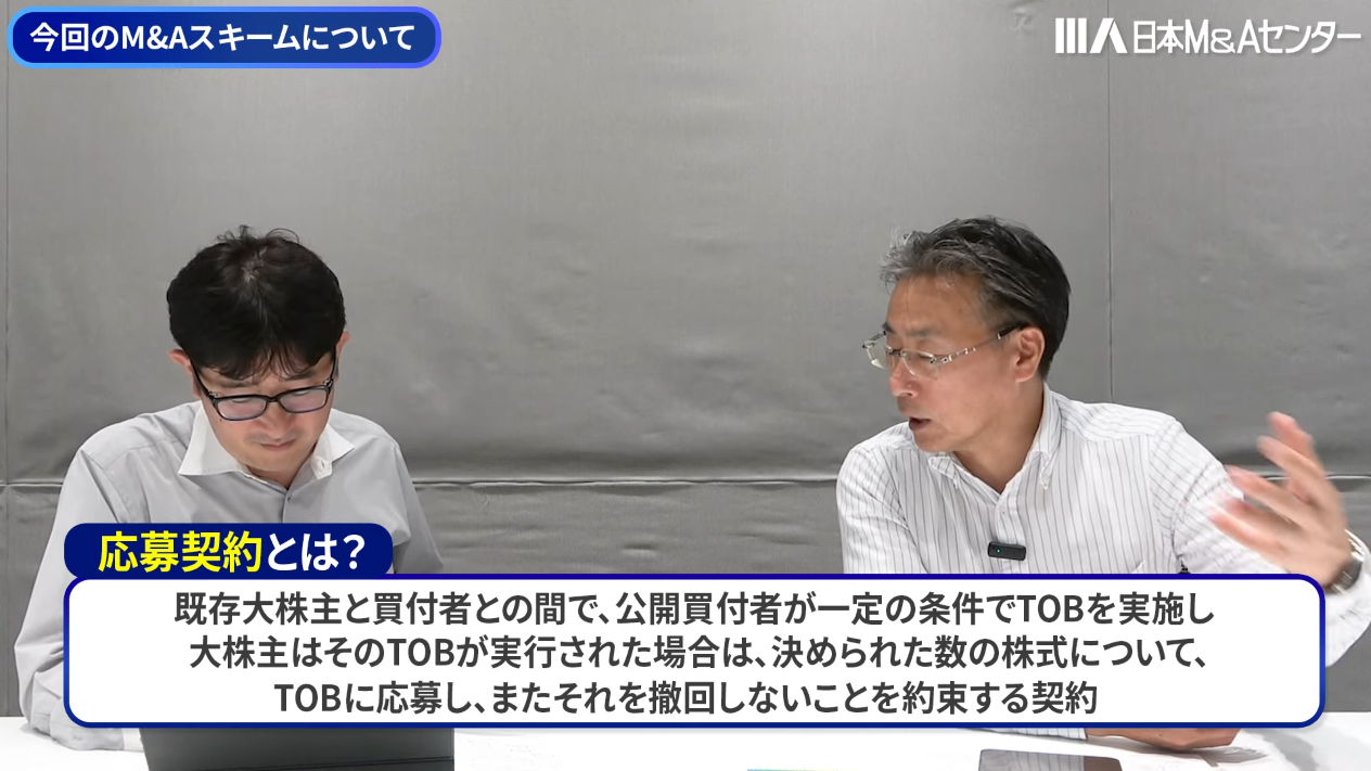 臼井: 一点興味深いのは、今回公開買付の対象、よく公開だと「応募契約」っていうのがあって「公開買付をかけたら必ず買い付けに申し込んでくださいね」と株主との間で「公開買付に申し込みます」っていう契約を結ぶのが通例なんです。