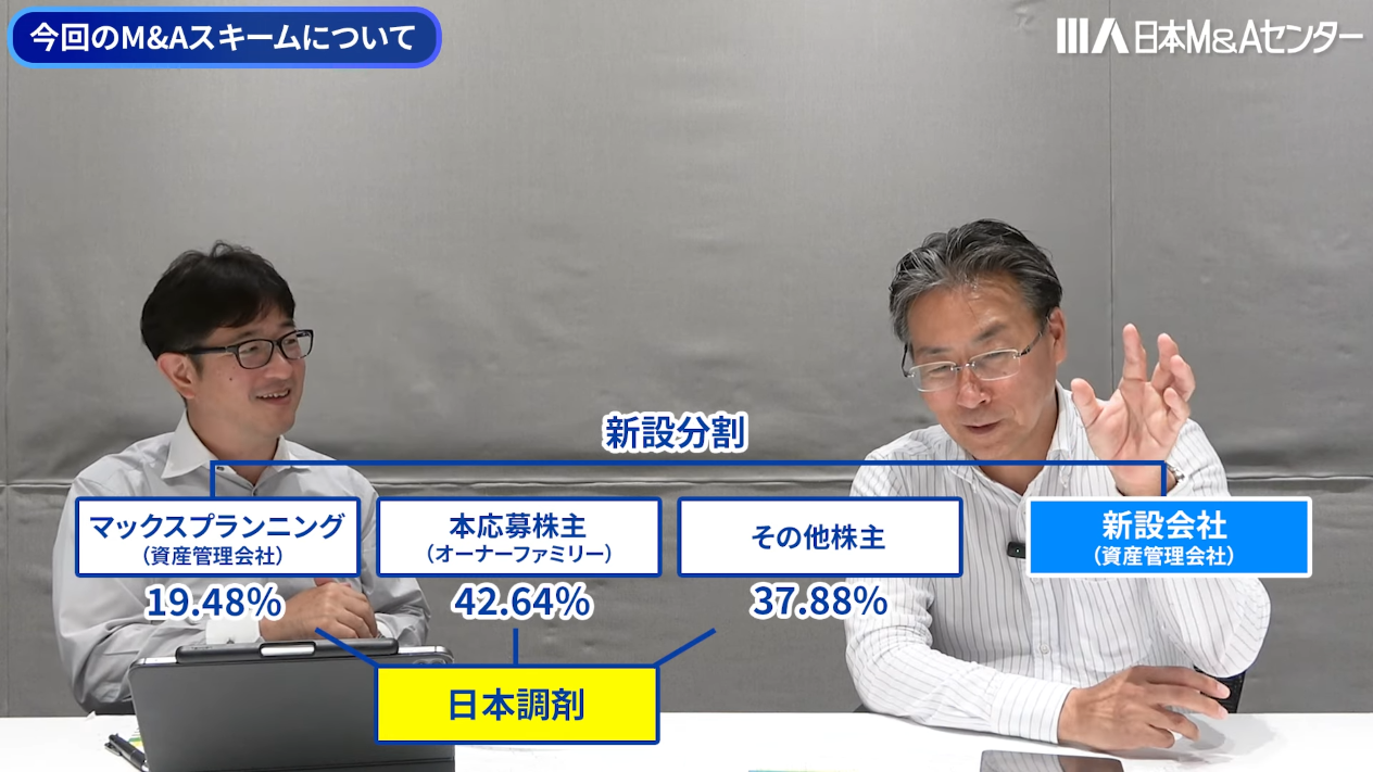このMPという会社をTOBの期間並行して、日本調剤の株式を持ってるMPと、それ以外の資産は会社分割(新設分割)でまたオーナーに渡しますと。