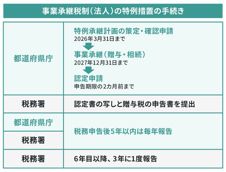 特例事業承継税制の場合は、2026年3月31日までに都道府県庁に特例承継計画の提出が必要です。実際の事業承継が、贈与または相続によって行われ、株式等の承継が実行されることになります。この際、先代経営者や後継者の要件を満たしておくようにしましょう。