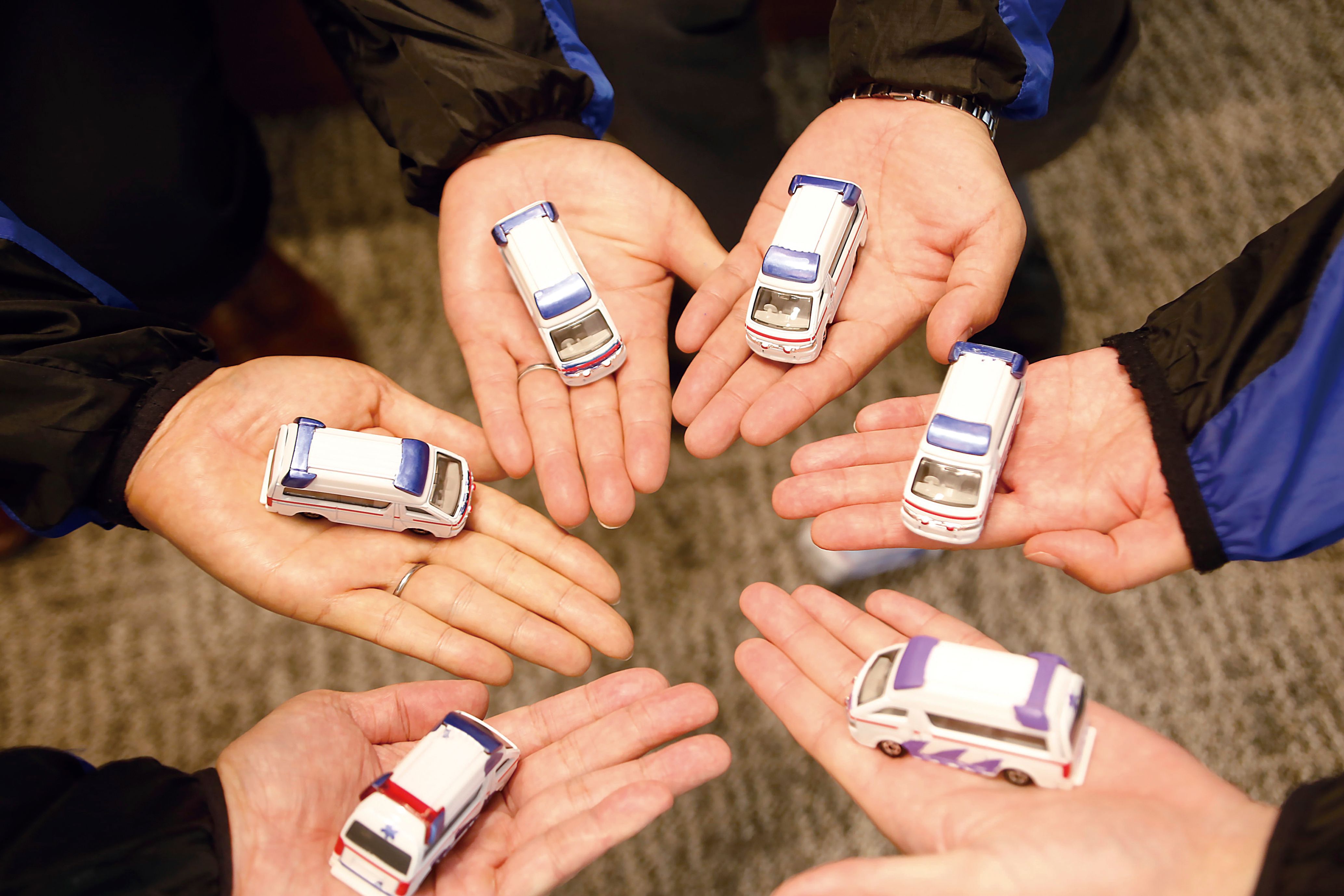 この日、M&A成約式の会場は賑やかな空気に包まれていました。用意されていたのは救急車のミニカー。これを出席者全員が手に取り、譲渡企業で民間救急事業を営むアンビュランスの車両仕様に塗っていたのです。
