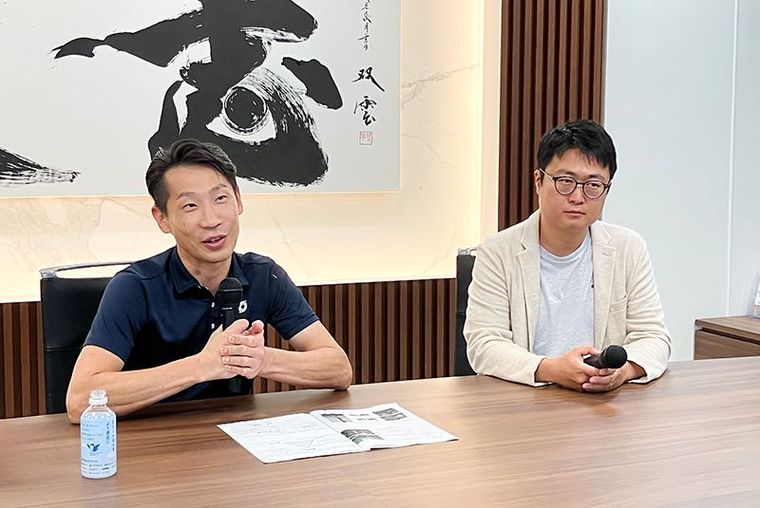 (写真左から)サラリーマンから経営者になった自身の経験を語る松浪氏と司会を務めるバトンズ 取締役 海山 龍明氏
