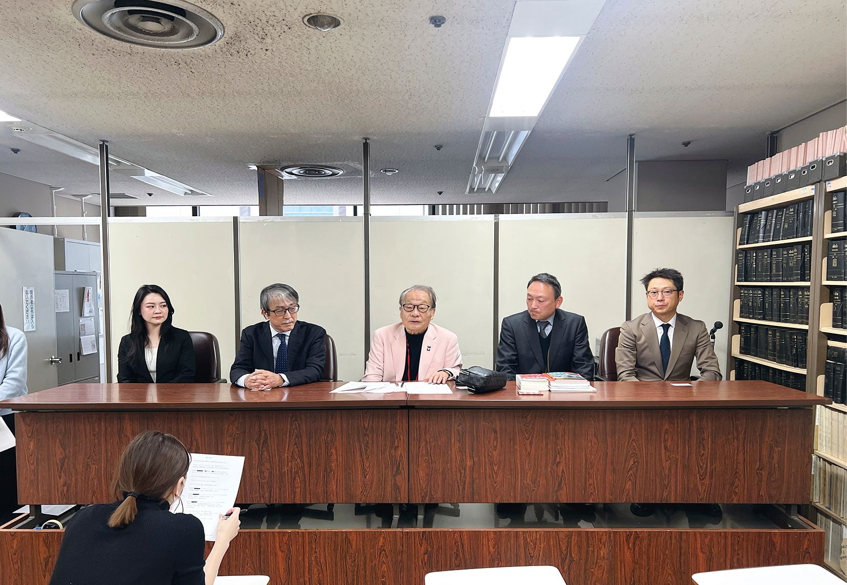 新経営陣と労働組合執行委員長による記者会見。中央は代理人の河合弘之弁護士