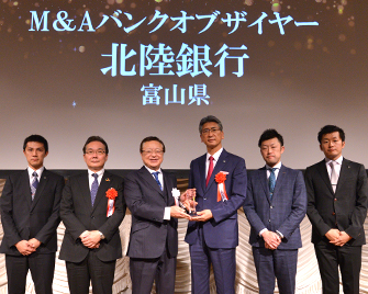 本年の最高賞「バンクオブザイヤー」は、北陸銀行様が受賞されました。北陸銀行様は、いち早く地域企業の事業承継及びM&Aニーズに着目され、組織体制を構築するとともに、各支店への啓蒙活動及び情報開発に尽力されてきました。それにより2018年度は複数の大型案件も成約させるなど圧倒的な実績を残されました。また、成約・受託件数を初めとする主要項目全て前年度トップの実績を残されております。