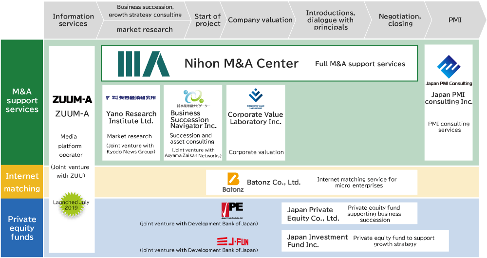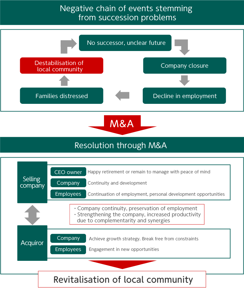 The Company offers support services from various perspectives for successful M&As. The owners of sellers have a sense of responsibility and attachment to their company due to the fact that they had developed it for many years, and sometimes feel anxiety and a sense of loss after transfer. Our support gives the owners of sellers confidence in the new stage, so that they can pursue the second life with peace of mind. In addition, we provide support services for post-merger integration (PMI) process. We support the success of both sellers and buyers after M&A deal conclusion.