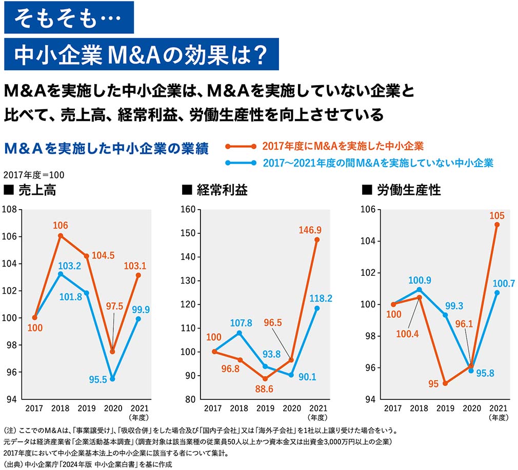 M&Aを実施した中小企業は、M&Aを実施していない企業と比べて、売上高、経常利益、労働生産性を向上させていることが、以下のグラフから読み取れます。