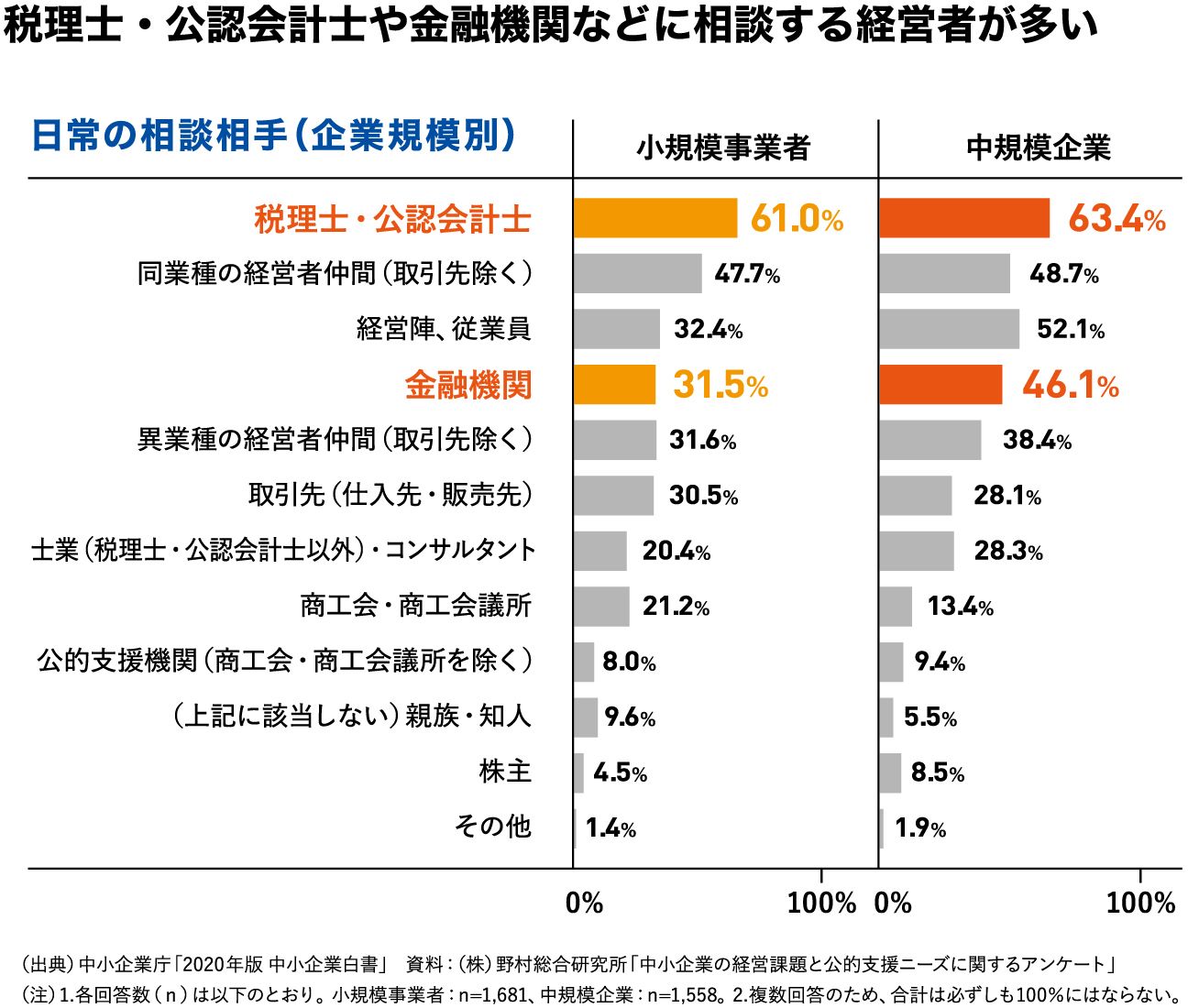 経営者の日常の相談相手としては、税理士・公認会計士や金融機関などが多く挙がります。