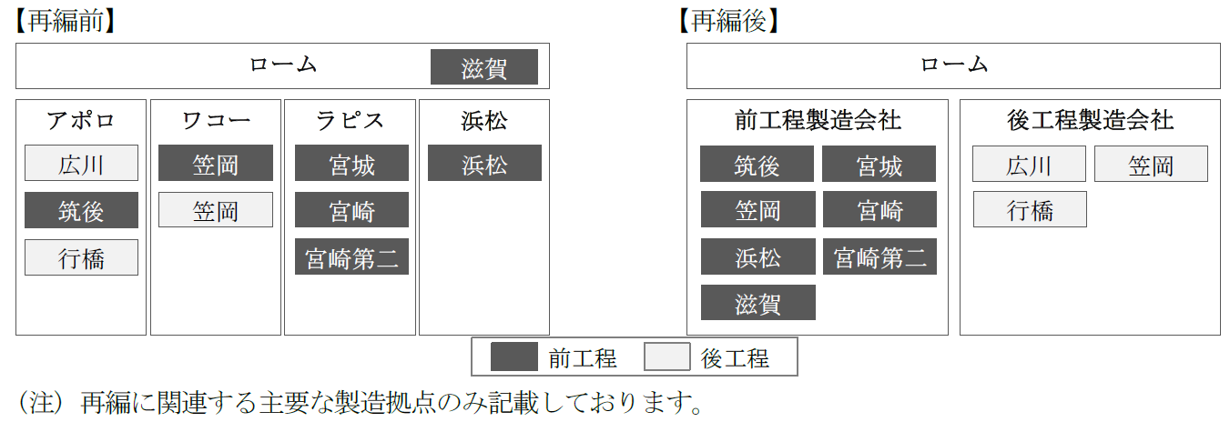 ローム・アポロ株式会社(福岡県八女郡)、ローム・ワコー株式会社(岡山県笠岡市)、ローム浜松株式会社(静岡県浜松市)の3社を前工程の製造会社(以下:前工程製造会社)と、後工程の製造会社(以下:後工程製造会社)2社に再編する。