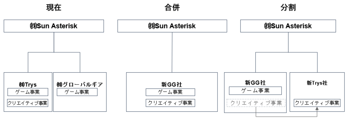 合併後に、新GG社のゲーム事業とイラストの受託制作等を手掛けるクリエイティブ事業を分社化することにより、事業の責任体制を明確にし、意思決定の迅速化及び経営効率の向上を図るため、新設分割により新Trys社を設立し、クリエイティブ事業を新Trys社に継承する。