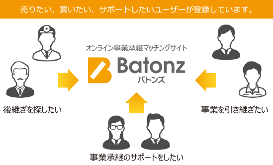 Batonz(バトンズ)https://batonz.jp/ とは、バトンズが運営するインターネットによるオンライン事業承継マッチングサービスです。会社や事業のあとつぎを探したい方から、後を継ぎたい方への経営のバトンタッチを、全国約900の士業事務所、約95の金融機関などと協働しながらサポートしています。