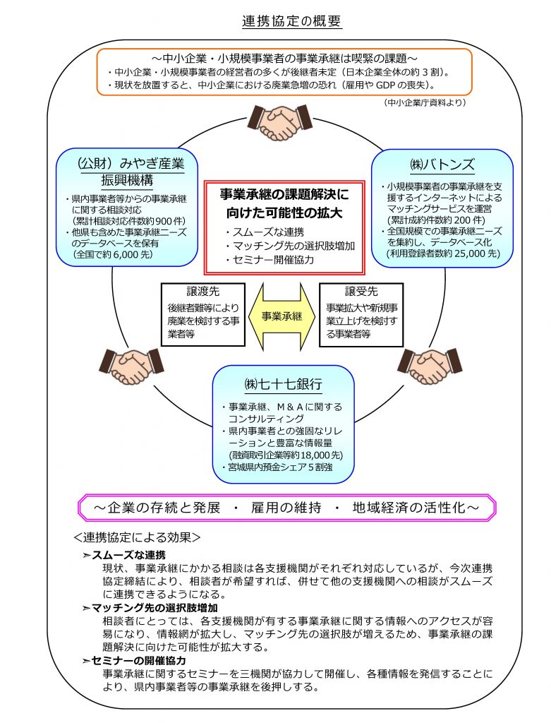 日本M&Aセンター子会社で、オンライン事業承継マッチングサービスを展開する株式会社バトンズ(本社:東京都千代田区、代表取締役社長:大山敬義、URL:https://batonz.jp/ )と、株式会社七十七銀行(本社:宮城県仙台市、頭取:小林英文、URL:https://www.77bank.co.jp/ )、公益財団法人みやぎ産業振興機構(所在地:宮城県仙台市、理事長:若生正博、URL:https://www.joho-miyagi.or.jp/ )は、事業承継支援に関する連携協定を、2019年6月17日に締結しました。