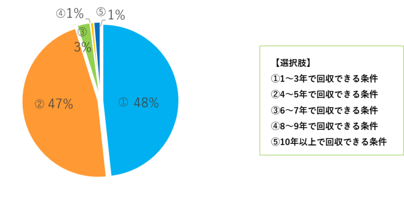 M&Aで会社を譲り受ける場合、妥当と考える株価条件については、95%の経営者が「5年以内」に回収ができる条件と回答しています。