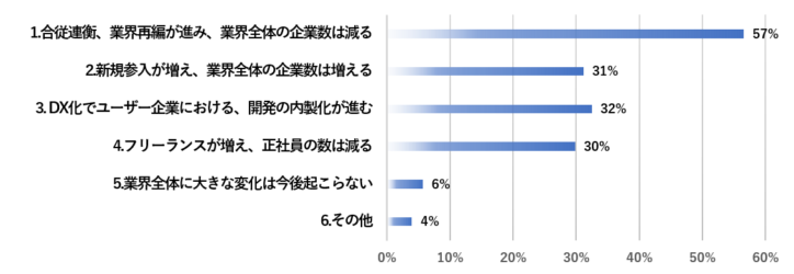 ■ITソフトウェア業界の未来は、再編が進み企業数が減ると予想する割合が57%と最も多い結果に。