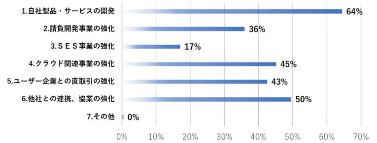 今後注力して行きたい事業戦略の1位は、「自社製品・サービスの開発」で64%、2位が「他社との連携、協業の強化」で50%という結果となりました。一方、「SES事業の強化」を掲げたのは、最も少ない17%という結果となり、他社との連携も視野に、労働集約型のビジネスモデルからの脱却をはかろうとされる経営者が多いことが伺えます。