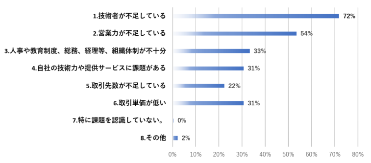 自社の経営課題については、技術者不足が72%で最も多く、次いで営業力不足が54%という結果で、人材不足が業界全体の課題であることが見てとれます。