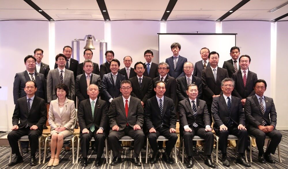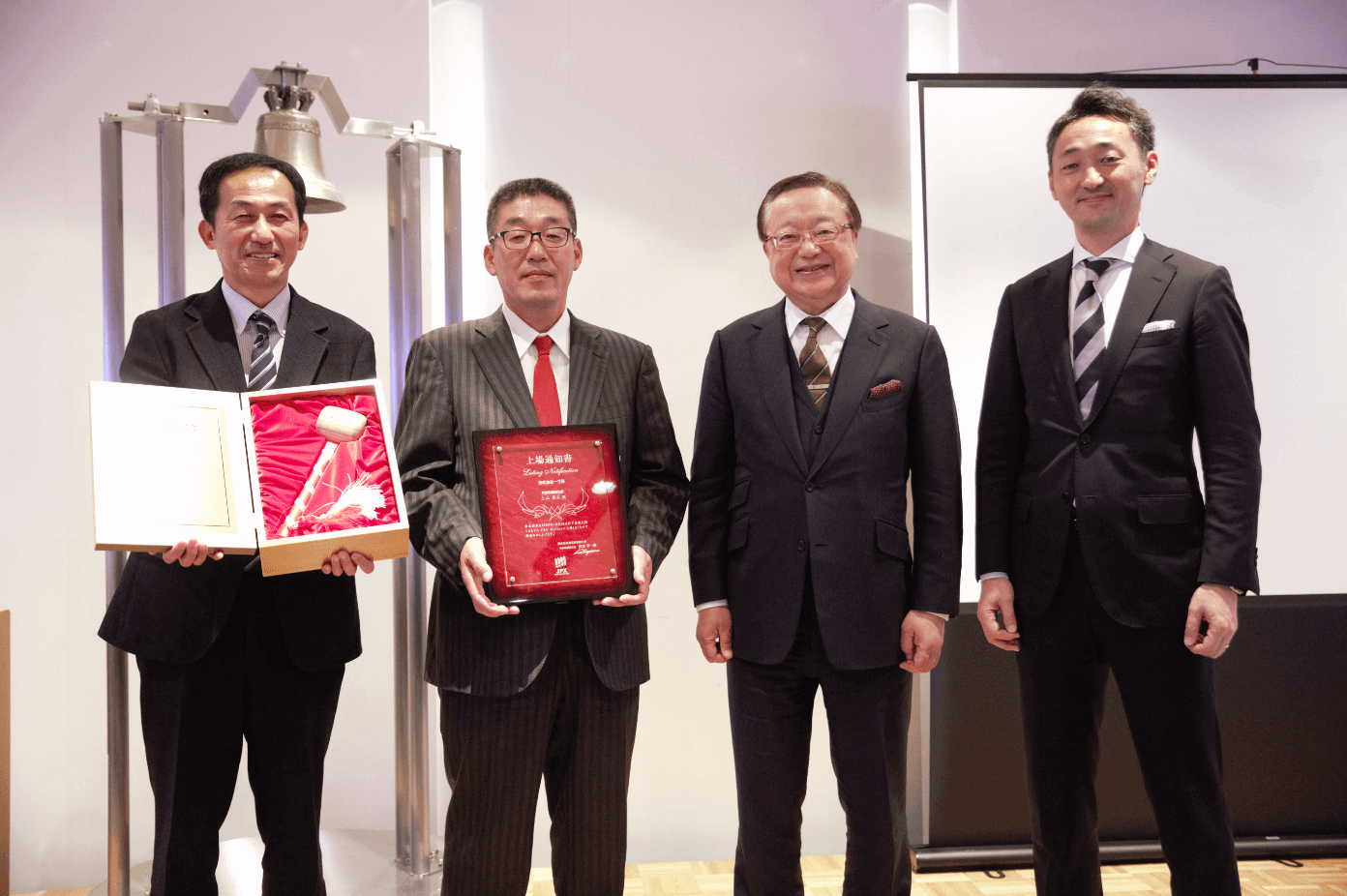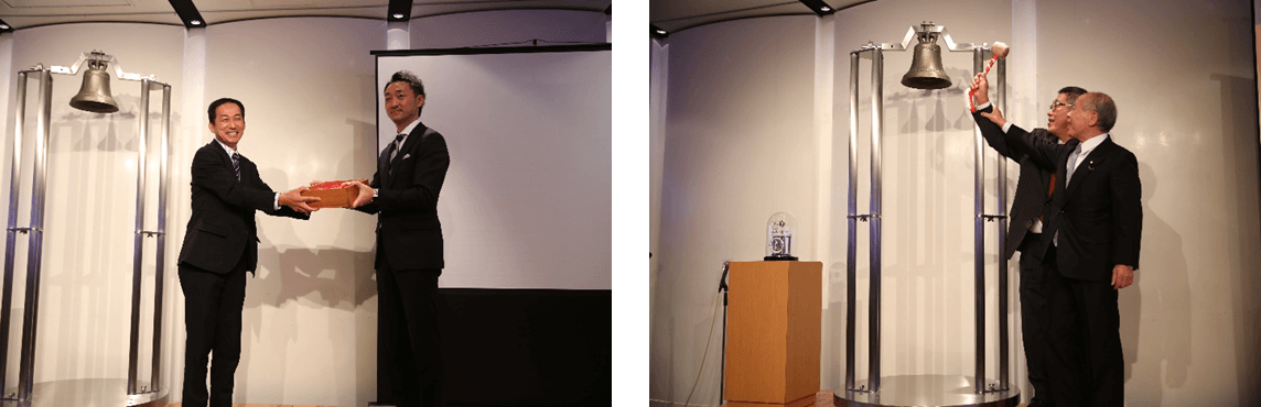 上場祝賀会の写真 左:記念品(打鐘で使う小槌)の贈呈 右:上場祝賀会での打鐘の様子