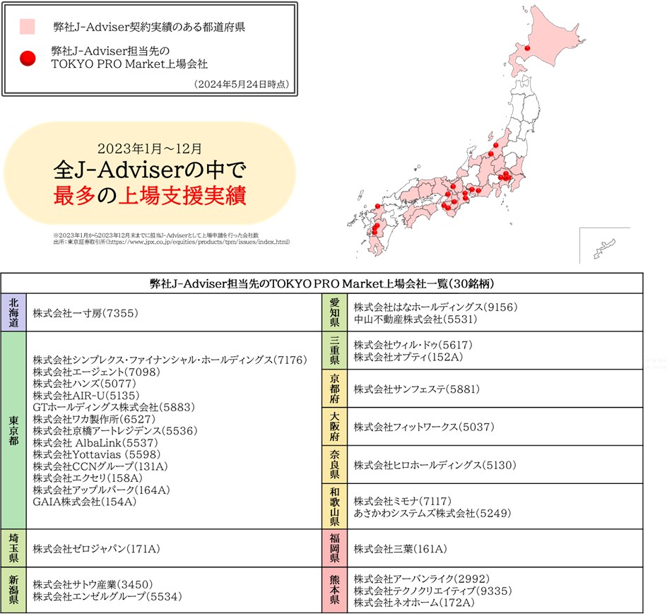 日本M&Aセンターでは、企業成長のさらなる促進・円滑な事業承継・一般市場への上場に向けた体制整備を目的にTOKYO PRO Marketへの上場支援に取り組んでおり、既存上場企業含め全国で100社以上のJ-Adviser契約実績があります。