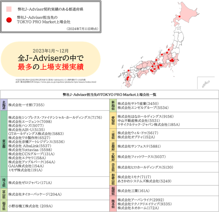 日本M&Aセンターでは、企業成長のさらなる促進・円滑な事業承継・一般市場への上場に向けた体制整備を目的にTOKYO PRO Marketへの上場支援に取り組んでおり、既存上場企業含め全国で100社以上のJ-Adviser契約実績があります。
