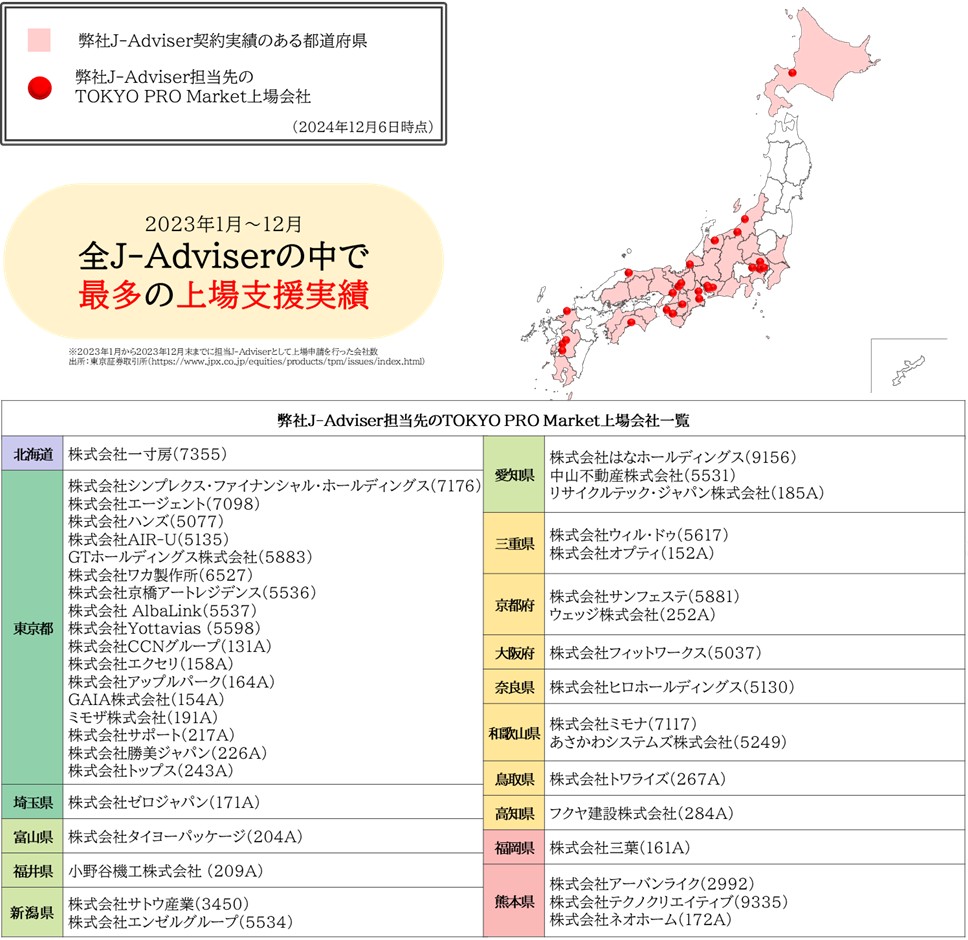 上場支援実績として現在までに、既存上場企業含め全国で100社以上のJ-Adviser契約実績を有し、44社のTOKYO PRO Marketへの新規上場申請を担当いたしました。