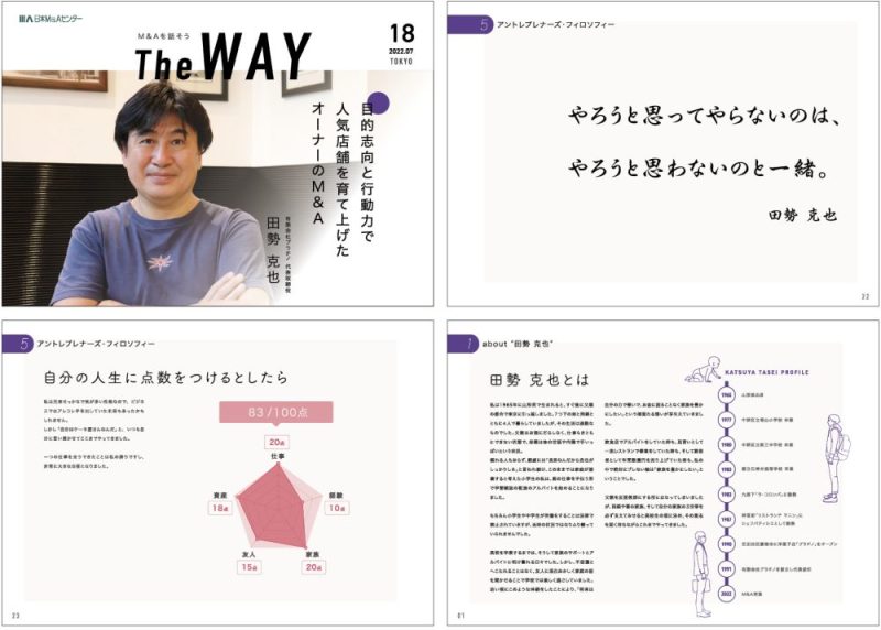 2021年から制作を開始した「The WAY」は、M&Aで会社を譲渡した経営者を対象とする無料のサービスで、希望する経営者にインタビューを行い、人生史として冊子にまとめたものをプレゼントしています。会社を譲渡された経営者の人生の起承転結(①生まれてから経営者になるまで、②経営者になってからの仕事、③事業承継・M&Aについて、④未来への夢・引継ぎたいもの)をお伺いしまとめます。これまで支えてこられたご家族や地域の方々、次世代に、歴史や想いを残すためのツールとしてご活用いただいています。