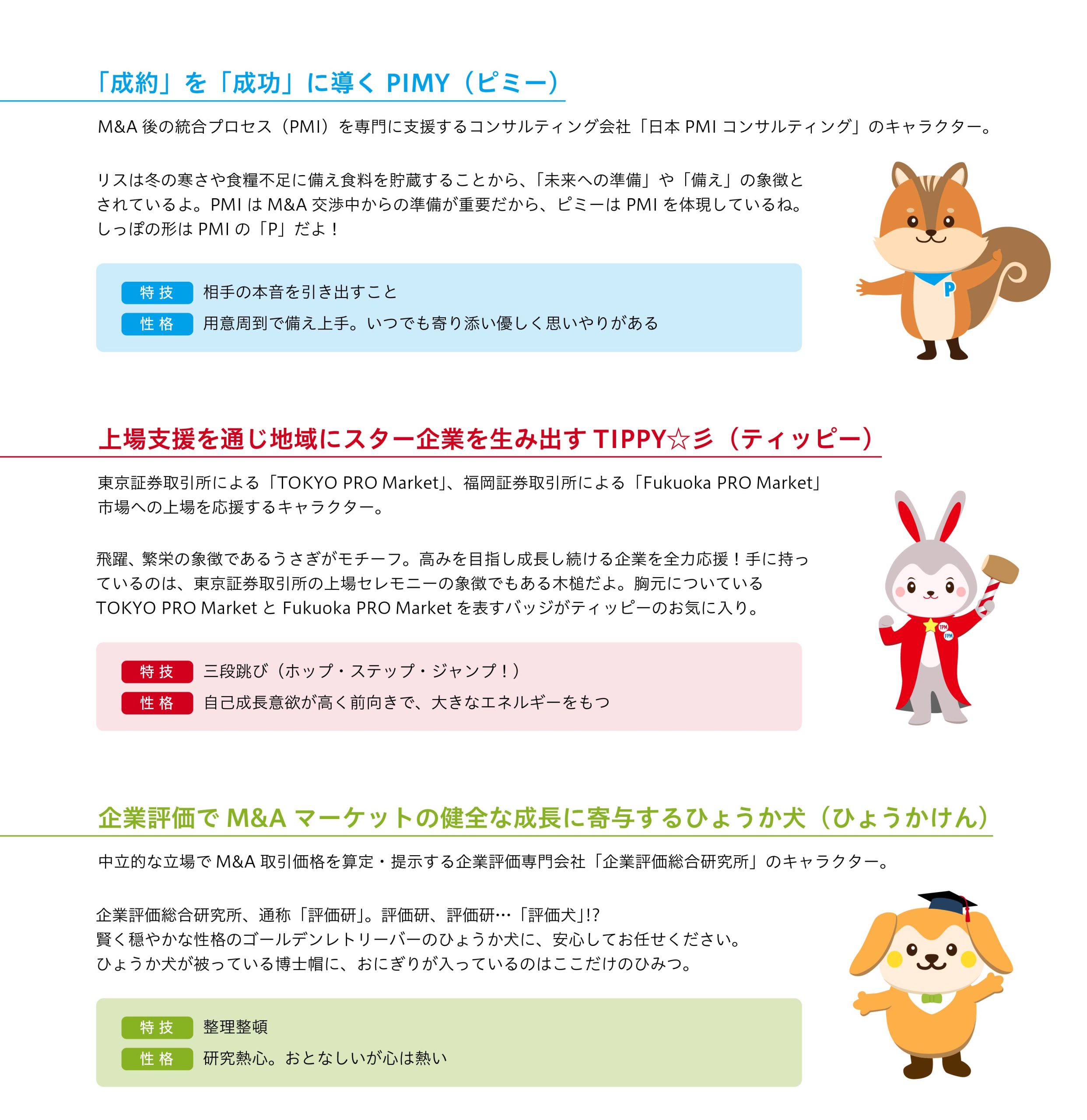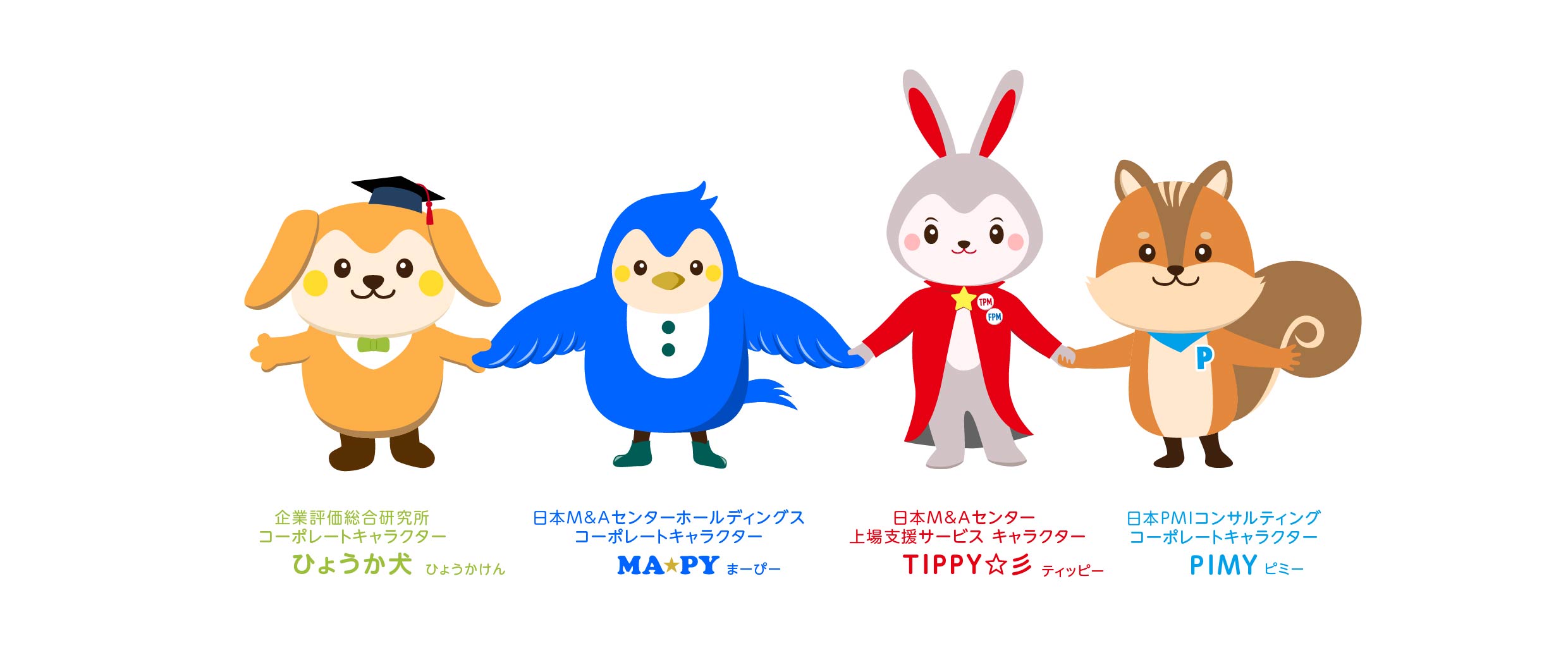 「PIMY(ピミー)」「TIPPY☆彡(ティッピー)」「ひょうか犬(ひょうかけん)」は、お客様や提携先のみなさまと円滑なコミュニケーションを図るため、日本M&Aセンターグループメインキャラクターの「MA★PY(まーぴー)」とともに中堅・中小企業を支援し、寄り添いながら活動してまいります。