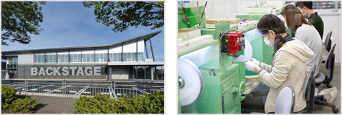 (左)2009年に設立された金子眼鏡の自社工房「BACKSTAGE」の新工場。効率ではなく品質にこだわった一貫生産体制で、企画・デザインから製造までのすべての工程をデザイナーや職人とともに行っています。 (右)自社工房「BACKSTAGE」での製造の様子