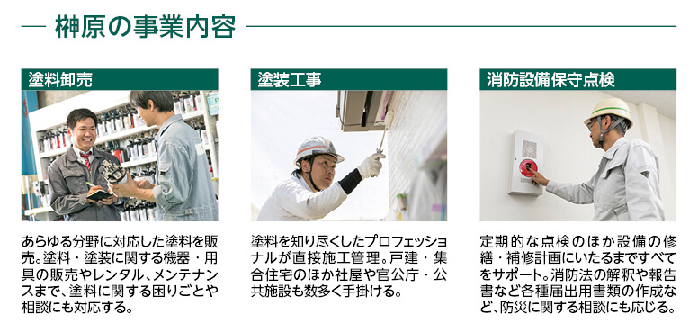 塗料については、工業用から自動車補修、構造物や建築物などあらゆる分野に対応した塗料を扱うほか、当社も調色設備と技術をもち、お客様が求める色を必要な量だけすぐに提供できる体制を整えています。 塗装工事も自社で職人を抱えて内製化し、直接施工管理を行っています。お客様からの塗装の相談に応えるかたちで先代の父の代から手掛けるようになりました。 消防設備の保守点検は、一見、当社とのつながりが感じられないかもしれませんが、1981年に消防法が大きく変わり、建築の基準が大きく変わったんです。実は、当社は1951年からガソリンスタンドの経営もしていましたので、消防設備士の資格を取得して塗料販売の傍ら点検業務も行うようになりました。 現在は、ワンストップでお客様の建物に関するお困りごとを請け負う会社として、おかげさまで知多半島でシェアナンバーワンの支持をいただいております。