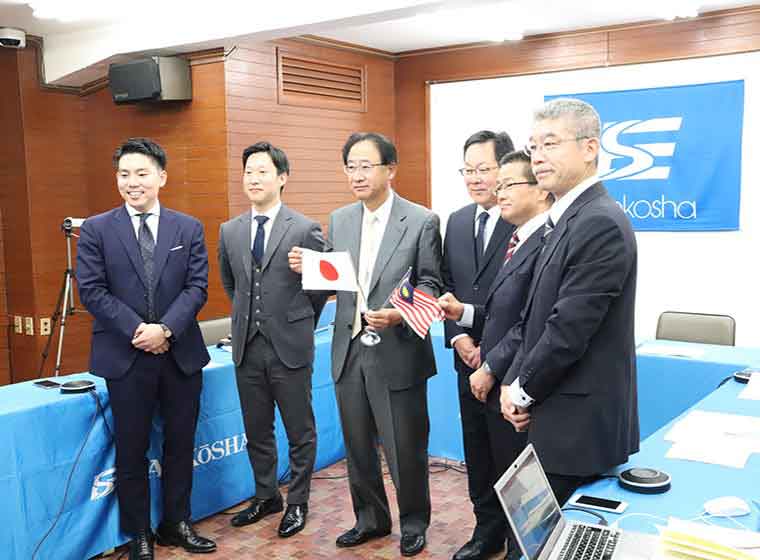 調印式でのサンコーシヤの皆様。日本とマレーシアの旗を持つ伊藤眞義社長から右に岡林親志常務、佐藤正明取締役、酒井和康担当部長(役職はM&A実行当時)