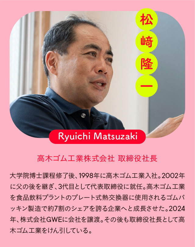 江戸時代に佐倉藩の城下町として栄え、蘭学の先進地として「西の長崎、東の佐倉」と呼ばれた千葉県佐倉市。この地に工場を構える高木ゴム工業(本社は習志野市)の取締役社長・松﨑隆一さんは、2024年11月に大阪を拠点とする株式会社GWEに会社を譲渡した。